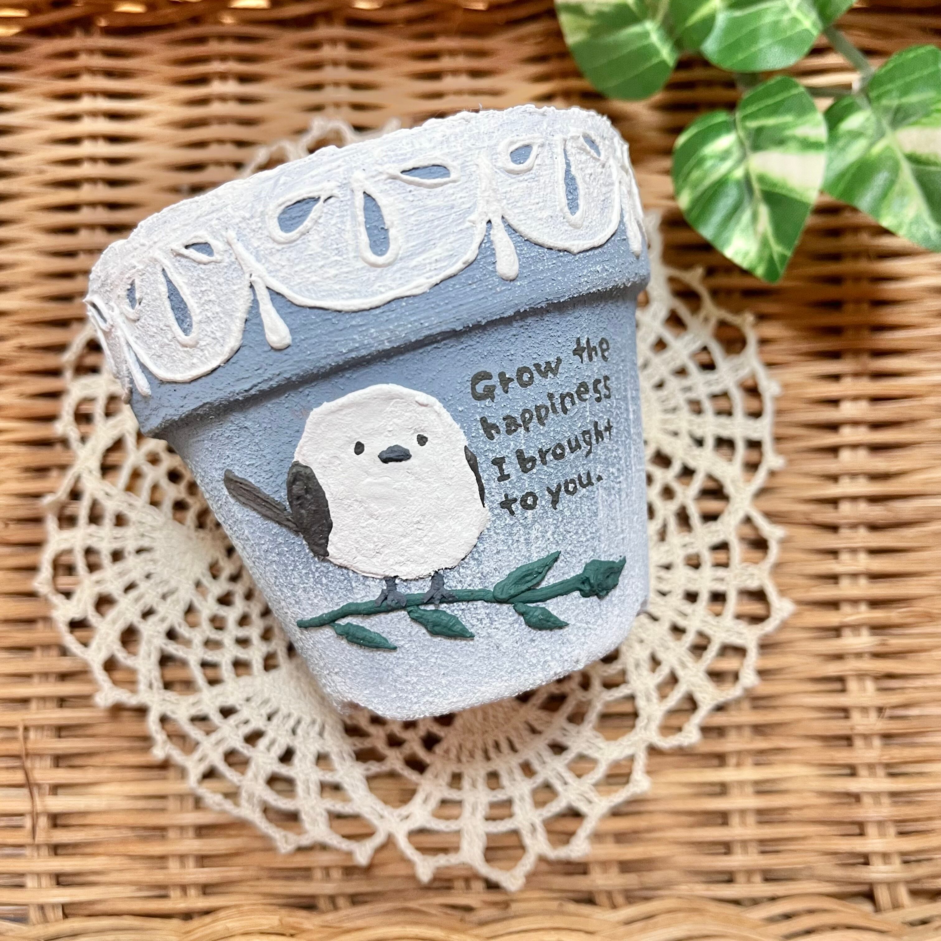 リメ鉢 手描き シマエナガ くすみカラー ガーデニング雑貨 観葉植物