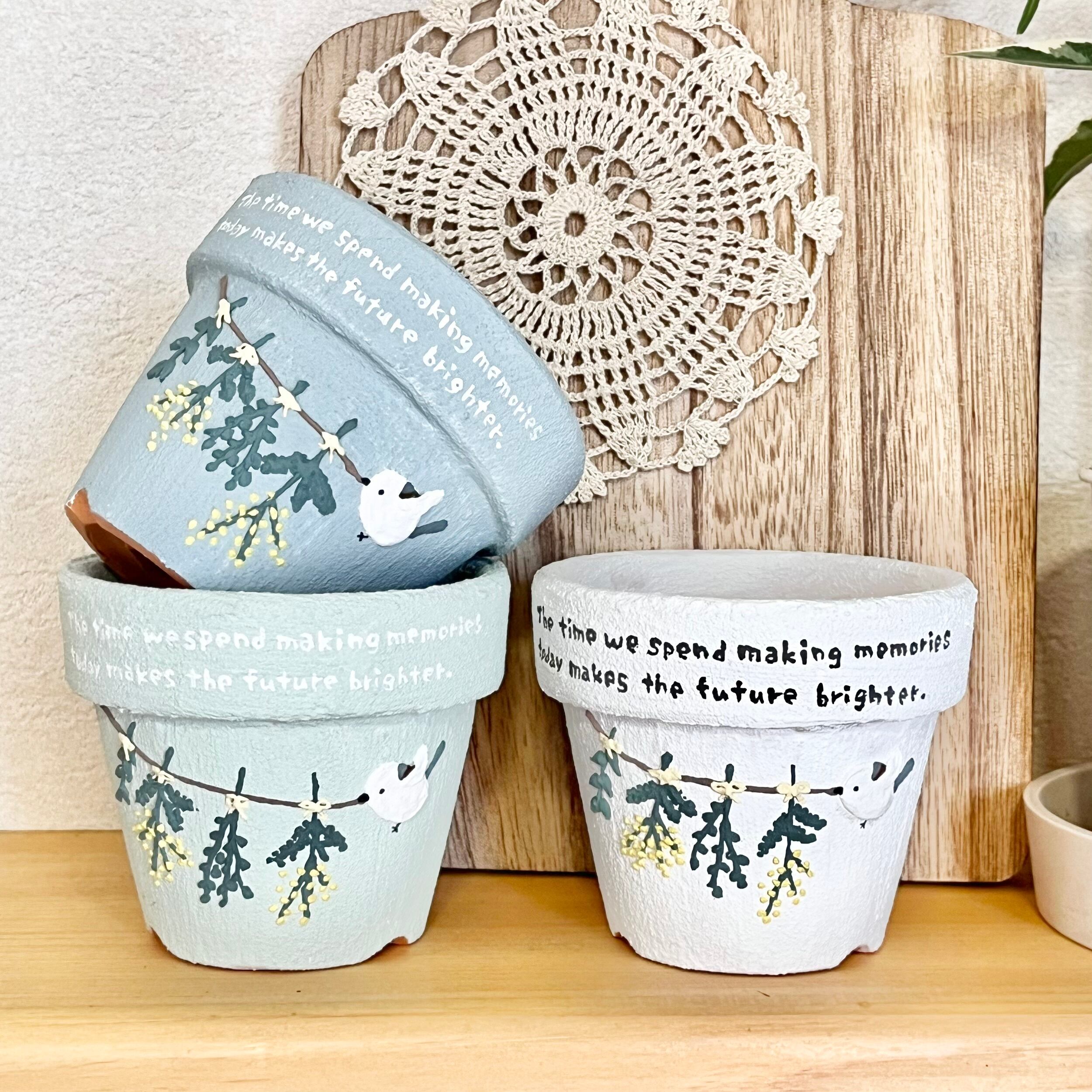 素焼き鉢を使用しており、1点ずつ手書きで制作していますので、世界に一つだけの表情が楽しめます。 写真の鉢との模様のズレや大きさの違いなどが生じますが、ご了承いただければと思います
